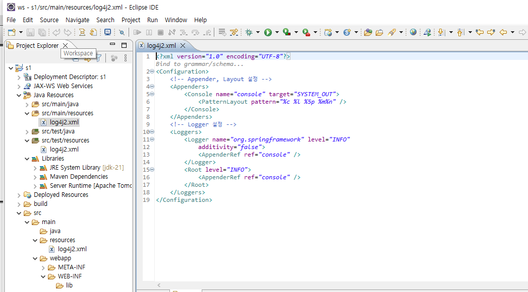 * /s1/src/test/resources/log4j2.xml 에 다음 내용 추가
