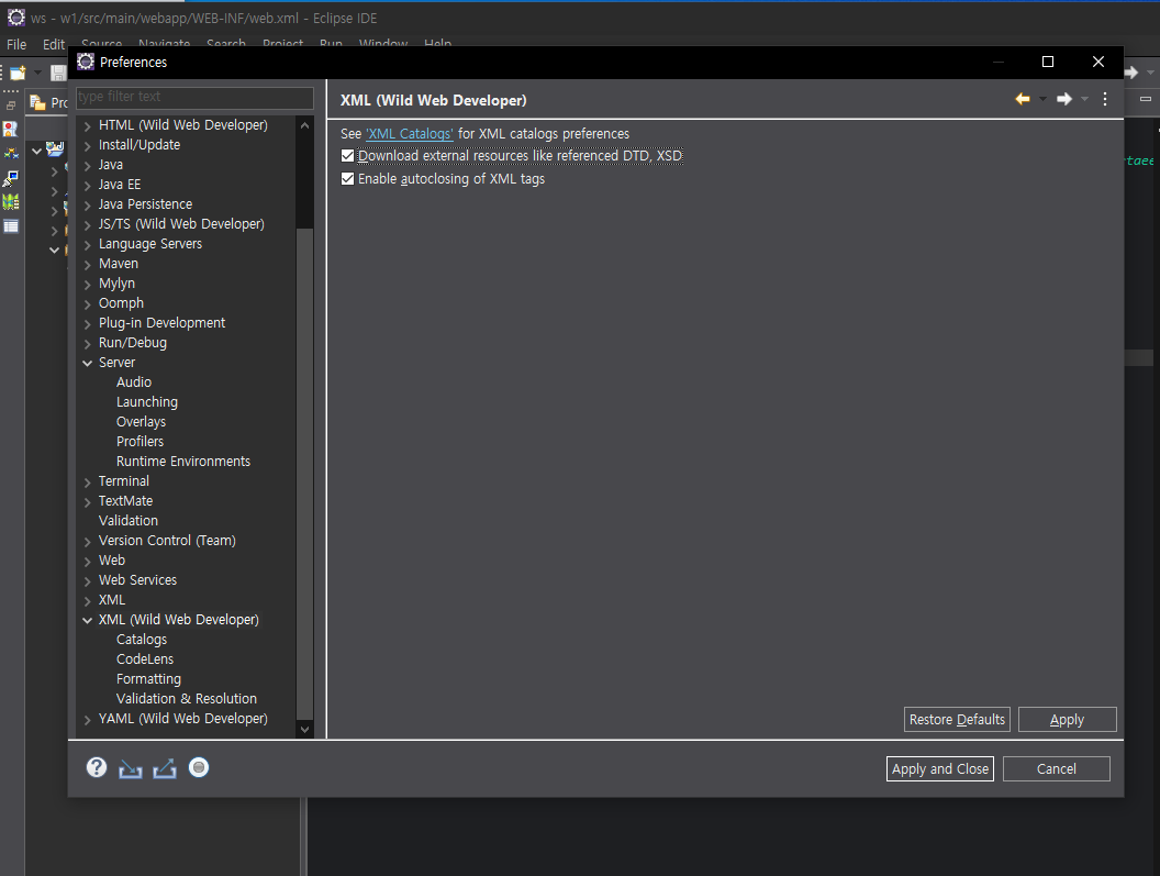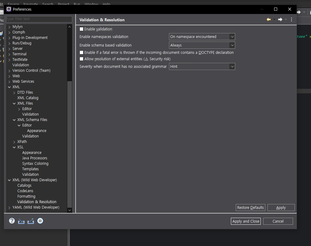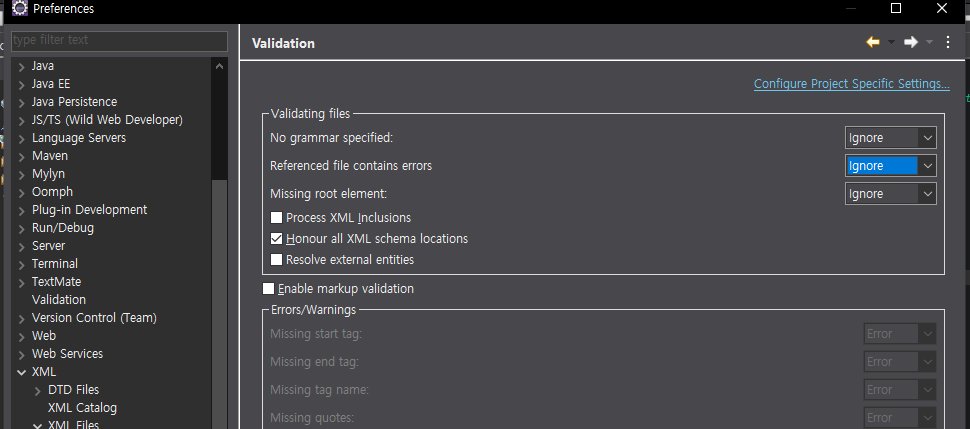 xml/Xml Files/Validation -> Referenced file contains errors를 Ignore로 변경