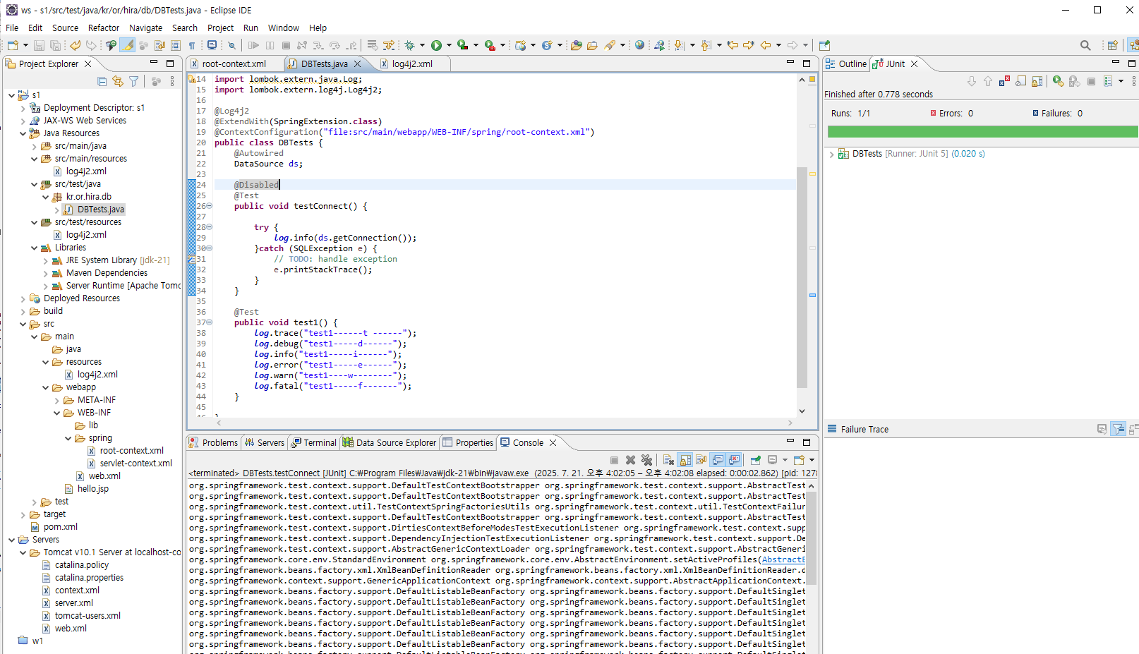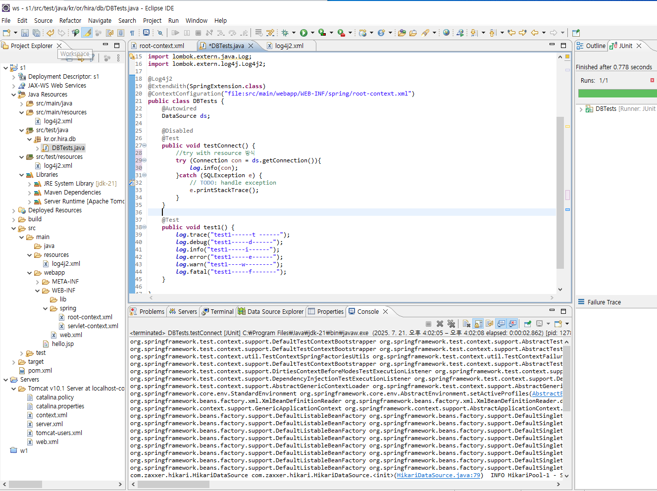 p.44 내용을 root-context.xml 에 넣고, 다음 로그 확인